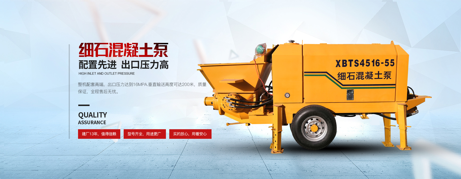 The fine aggregate concrete pump with advanced domestic configuration and high outlet pressure has been successfully developed